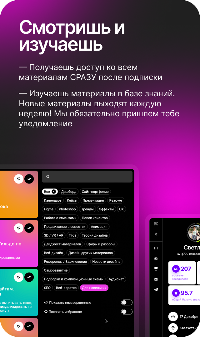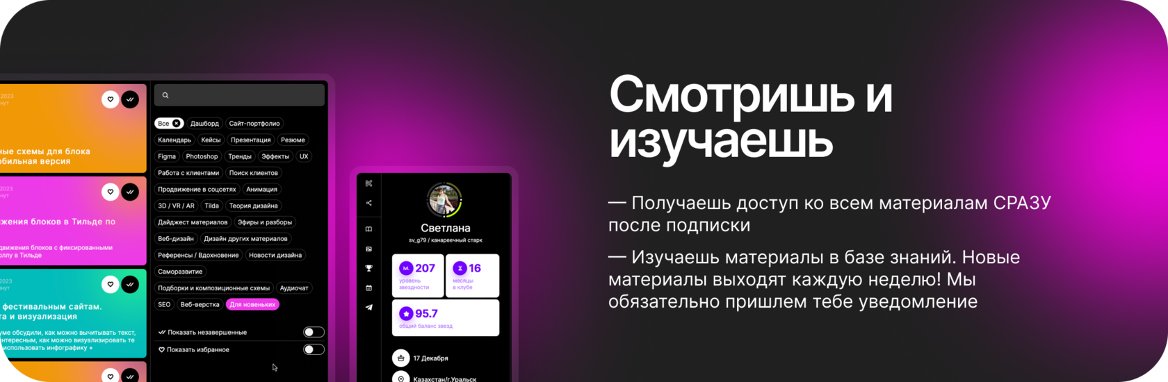 В базе знаний 400+ материалов по дизайну, трендам, эффектам, UX, работе с клиентами и другим темам – выбирай то, что нужно именно тебе!