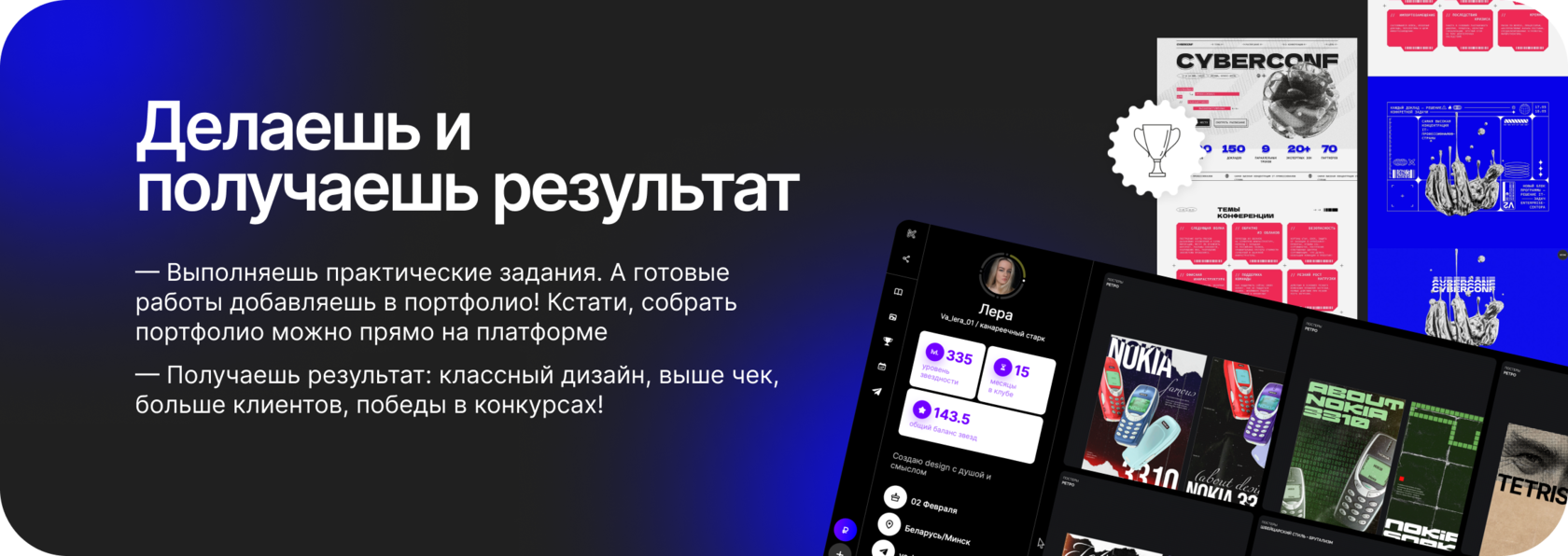 Не просто смотришь видосики, а набиваешь руку на практике, делаешь работы и пополняешь портфолио – в общем, развиваешься продуктивно!