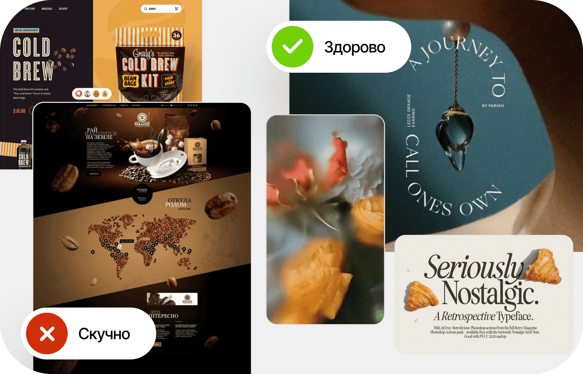 Для начала мы посмотрим на примере, как дизайн меняется в зависимости от использованных референсов. На одну и ту же тему можно сделать очень разный дизайн: скучный и шаблонный или креативный и необычный.